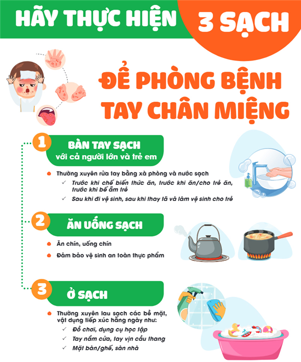 Hiện nay chưa có vắc xin phòng bệnh và chưa có thuốc điều trị đặc hiệu, vì vậy phòng bệnh là biện pháp quan trọng nhất nên thực hiện "3 Sạch" để bảo vệ trẻ và gia đình: